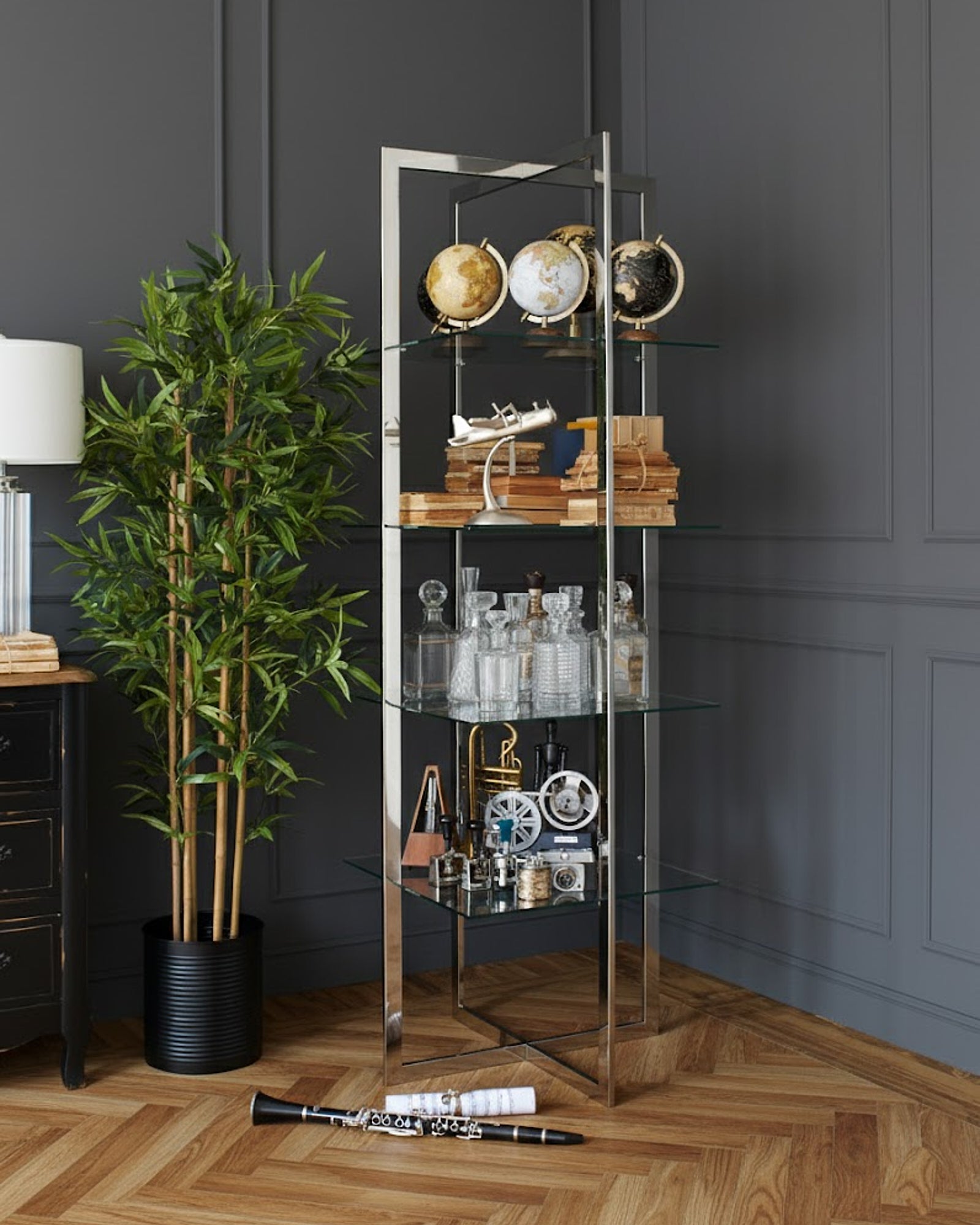 - Materialien: Gestell aus poliertem Stahl, Regalböden aus transparentem Sicherheitsglas