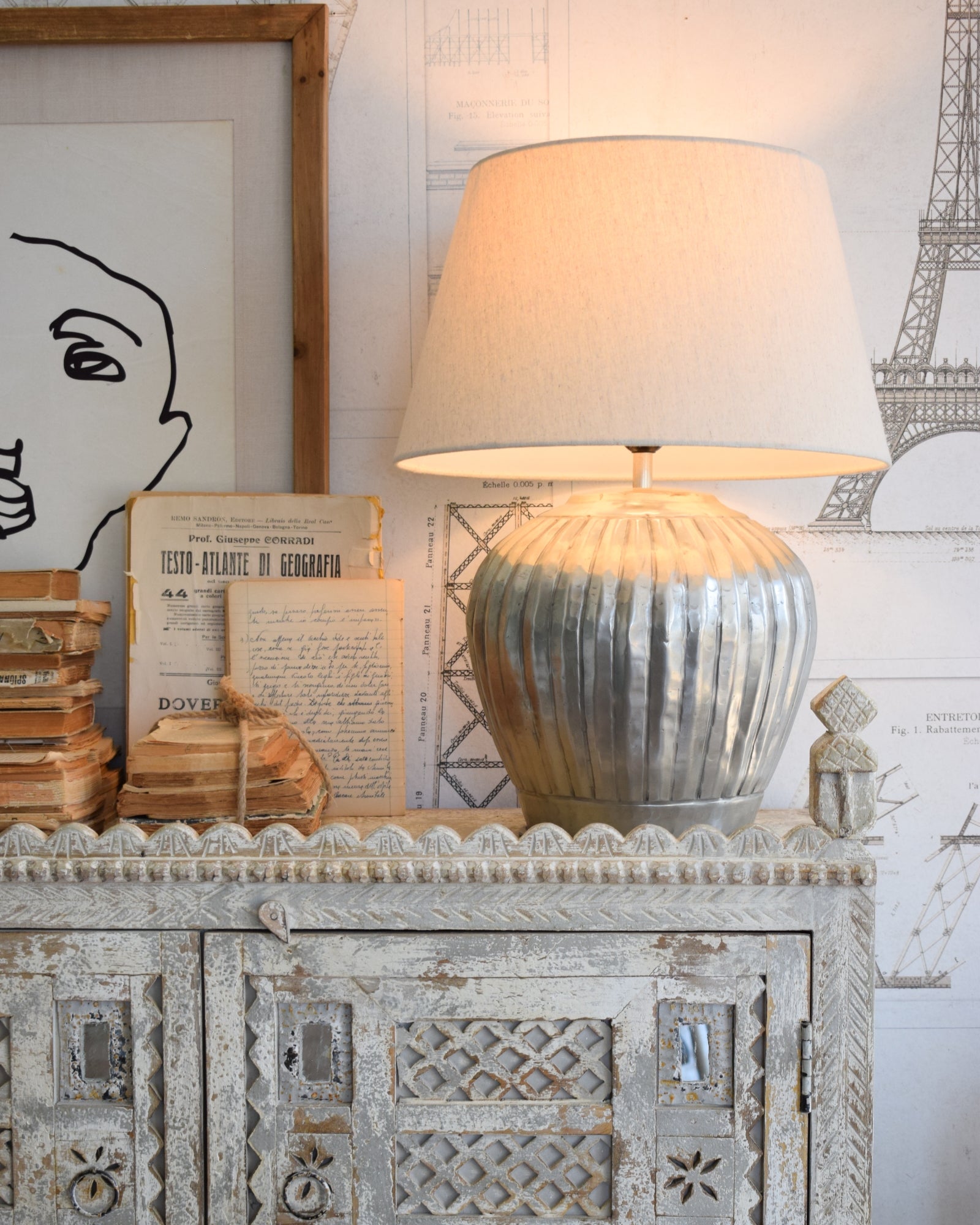 Das zweitürige Sideboard „Gujarat“ aus massivem Mangoholz mit natürlicher, gebleichter Oberfläche erinnert in Form und Detaillierung an die charakteristischen Damchya, traditionelle indische Aufbewahrungstruhen, die einst zur Aufbewahrung der Aussteuer dienten. Fein verziert und mit zwei Türen und drei Schubladen ausgestattet, besticht es durch seine opulenten Details und die traditionelle Handwerkskunst Gujarats. Ein einzigartiges und originelles Möbelstück, das jeden Raum aufwertet – ein Sideboard, das die altehrwürdigen Handwerkstraditionen ehrt.