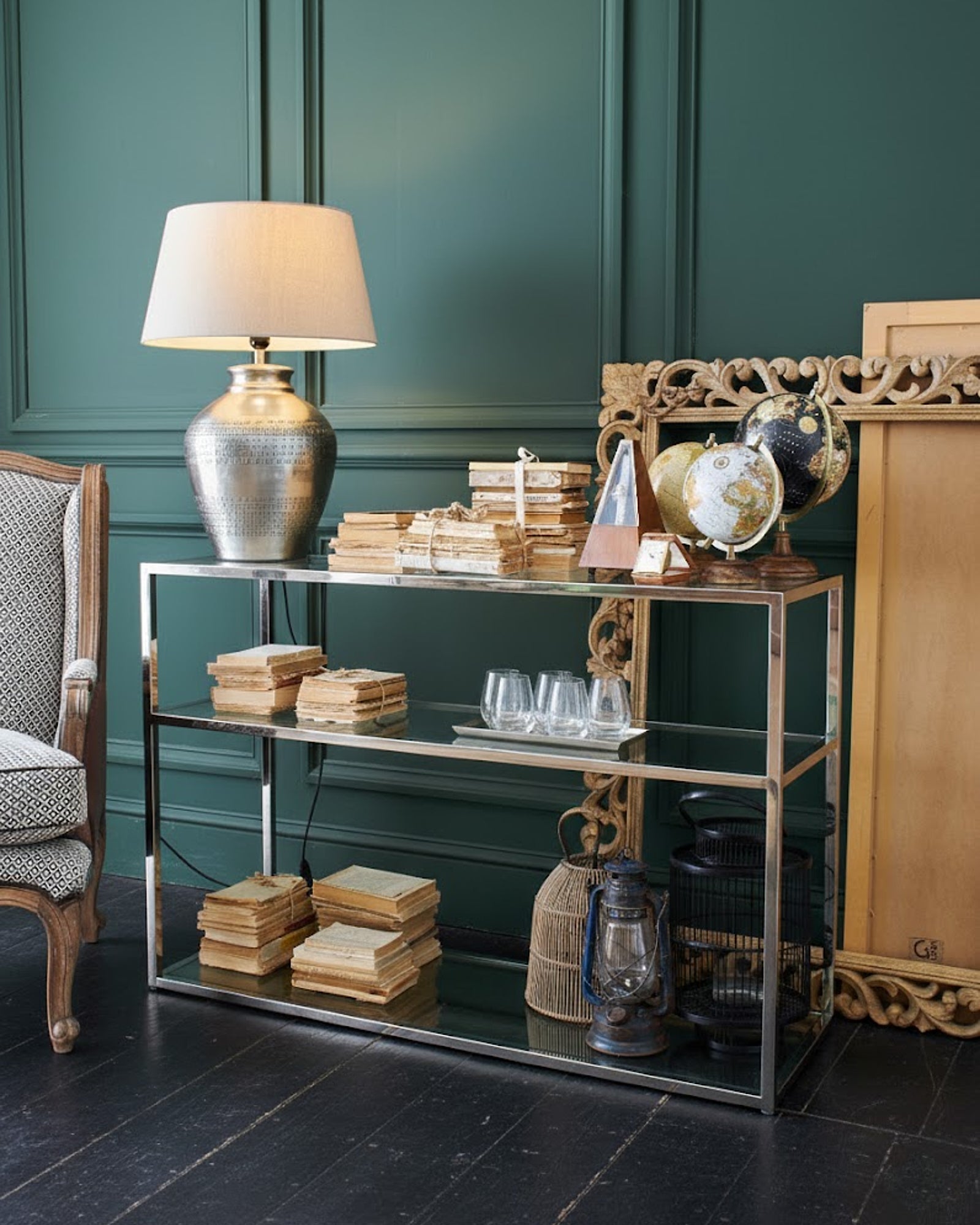 • Materialien: Gestell aus poliertem Stahl, Regalböden aus transparentem Sicherheitsglas